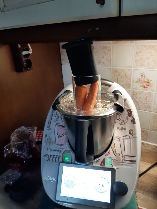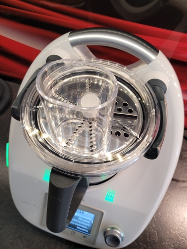 le TM6 fait des miracles pour mélanger et chauffer pendant de longues minutes sans risque que cela n’accroche aux parois ou brûle). Je le lance le matin avant de descendre balader Pixel et lorsque je remonte il est prêt et gardé à la bonne température dans le bol de mon Thermomix !